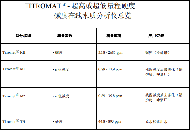 Titromat®M2 应用于自动测定和监测超低测量范围内的碱度。 测量范围: 碱度: 0.89 - 35.8 mg/l (ppm) (分辨率 0.89 ppm) 供电电压和订货号: