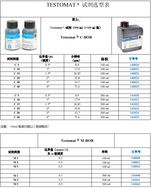 Testomat 2000® THCl 设备利用光度计根据光度分析原理去滴定在范围 0-2.5 ppm 中的氯含量和在范围 4.48-44.8 ppm 中的硬度。 功能优势 • 通过 LCD 屏幕显示菜单和操作程序 • 多种硬度,碱度,p 碱度,负 m 碱度不同测量范围试剂供选择 • 多种硬度单位,°dH,°f,ppm CaCO3,mmol / l • 使用活塞计量泵进行高精度滴定 ,30 微升每滴 • 分析启动: -自动时间间隔分析水质(0-99 分钟) -外部信号启动设备 -通过水流量表设置水流量间隔分析水质 • 可用外部信号停止或开启设备分析 • 2 个独立自定义边界值,并可设置出现多少次越边界值时才触发警报 • 显示分析过程和功能失调时的错误原因 • 2 路水样检测 • 试剂容量:100 和 500 毫升/瓶 • 可选模拟信号输出 0/4 - 20 mA ,SD 卡,RS232 插卡 • 自定义设备维护间隔 技术参数 功率消耗:max. 30 VA 防护等级:I 保护类型:IP 65 环境温度:10–45 °C 水温:10–40 °C 尺寸(宽 x 高 x 深):380 x 480 x 280 mm 重量:约 9,5 kg 工作水压:0,3 至 8 bar / 0,3 x105 至 8x105 Pa 0,3 至 1 bar / 0,3x105至 1x105 Pa (拆下水压调节阀) 测量范围:总氯: 0.00-0.99 ppm(分辨率:0.01 ppm) 1.0-2.5 ppm (分辨率:0.01 ppm) 硬度: 4.48-44.8 ppm(分辨率:0.05 ppm) 供电电压和订货号: