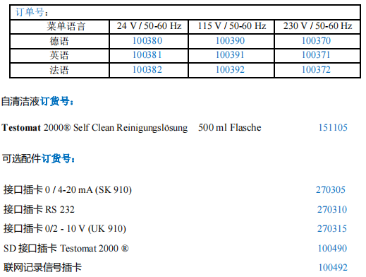 Testomat 2000® Self Clean 是 Testomat 2000® 的一个特殊版本,它多增加了一个试剂泵用来在水质分析之后向测量槽中加入清洁剂。 使用这台设备可以避免测量槽和排水管的污染情况。经过被设置的分析次数后,测量槽被清洗,然后将 Testomat 2000® Self Clean 清洁液泵入测量槽,经过 30 秒的清洁反应时间后,测量槽被排空,最后对测量槽进行两次冲洗,结束清洁过程。 功能优势 • 通过 LCD 屏幕显示菜单和操作程序 • 多种硬度,碱度,p 碱度,负 m 碱度不同测量范围试剂供选择 • 多种硬度单位,°dH,°f,ppm CaCO3,mmol / l • 使用活塞计量泵进行高精度滴定 ,30 微升每滴 • 分析启动: -自动时间间隔分析水质(0-99 分钟) -通过水流量表设置水流量间隔分析水质 • 可用外部信号停止或开启设备分析 • 2 个独立自定义边界值,并可设置出现多少次越边界值时才触发警报 • 显示分析过程和功能失调时的错误原因 • 2 路水样检测 • 试剂容量:100 和 500 毫升/瓶 • 可选模拟信号输出 0/4 - 20 mA ,SD 卡,RS232 • 菜单语言有英语,德语,法语 技术参数 功率消耗:max. 30 VA 防护等级:I 保护类型:IP 65 环境温度:10–45 °C 水温:10–40 °C 尺寸(宽 x 高 x 深):380 x 480 x 280 mm 重量:约 9,5 kg 工作水压:0,3 至 8 bar / 0,3 x105 至 8x105 Pa 0,3 至 1 bar / 0,3x105至 1x105 Pa (拆下水压调节阀) 测量范围:硬度: 0.89-448 ppm 碱度: 8.9-358 ppm P 碱度: 0.1-15 mmol/l 负 m 碱度: 0.05-0.5 mmol/l 供电电压和订货号: